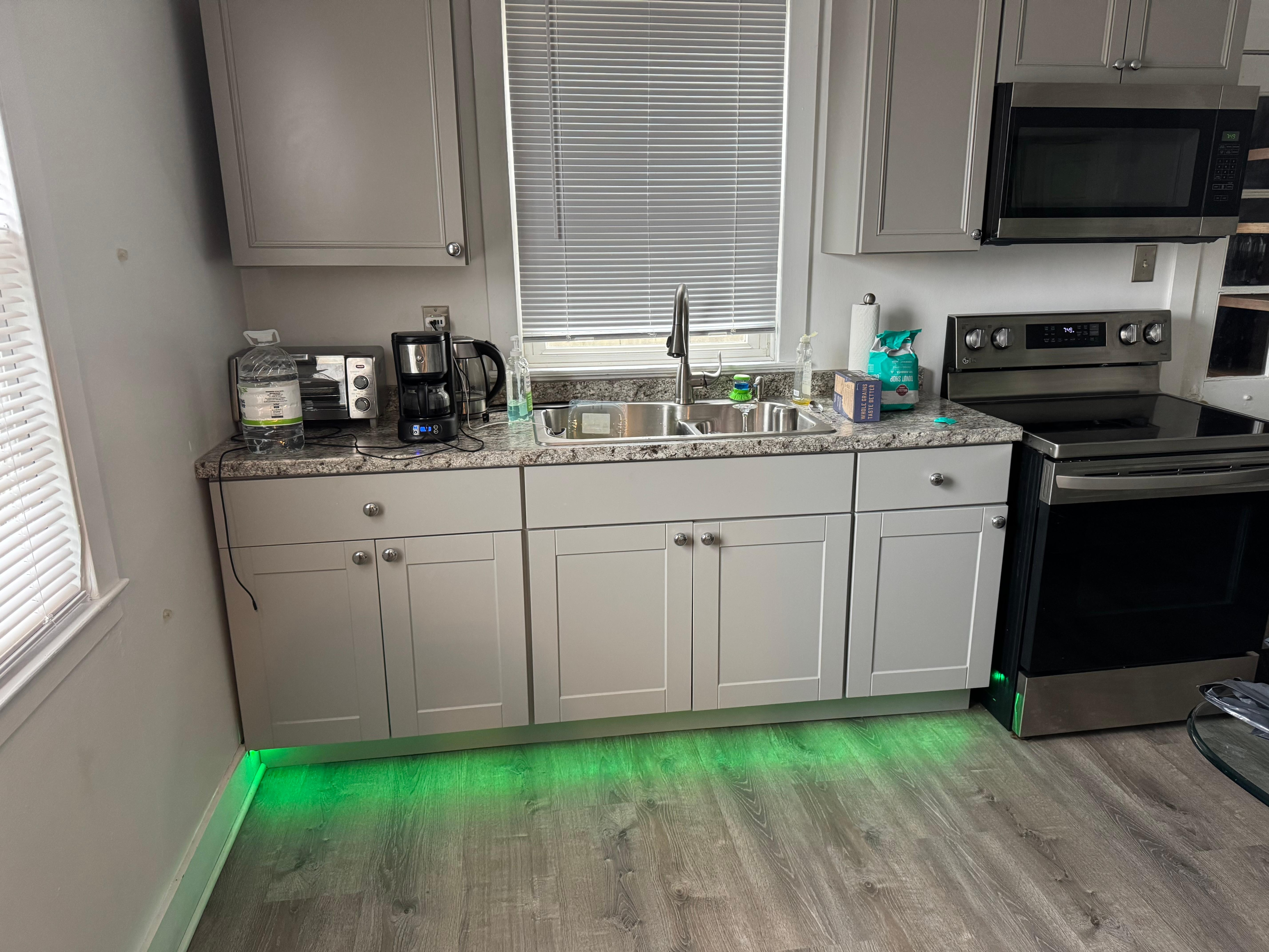 I think this property needs to update its photos. There were green lights on the ceiling, green lights in the kitchen. The lights would go on and off on their own even if you didn't pass them this unit was pieced meal together. It was done quickly to rent, but didn't take in consideration for the guests. The coffee pot only made 4 cups. What does it cost for a regular coffee pot? The table and the chairs don't match chair is too high table too low.There's no dishwasher which is not a problem, but there are no towels to dry the dishes for one night. Parking on the street we almost didn't get it. I'm glad we only had one vehicle. I wouldn't have been able to park the second one.It worked, but I would not recommend it for anybody that has more than two people, tops three.