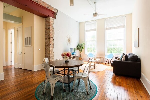 Historic Charm: Soaring 12-foot ceilings and massive windows that flood every room with natural light.