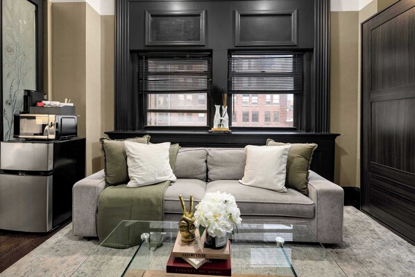 As you enter, you'll be welcomed by a tastefully furnished living area that also serves as the second bedroom, complete with a Queen-sized Murphy bed for your comfort. This clever design maximizes space while maintaining a cozy atmosphere, perfect for relaxing after a day in the city!