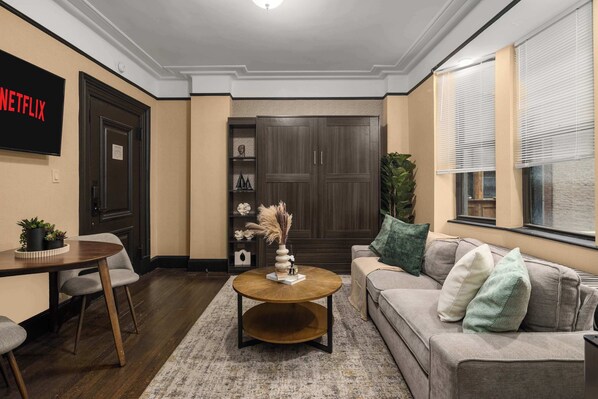 This apartment will provide guests with 2 beds (1 Queen murphy, 1 Queen) & 2 flat-screen TVs with air conditioning.