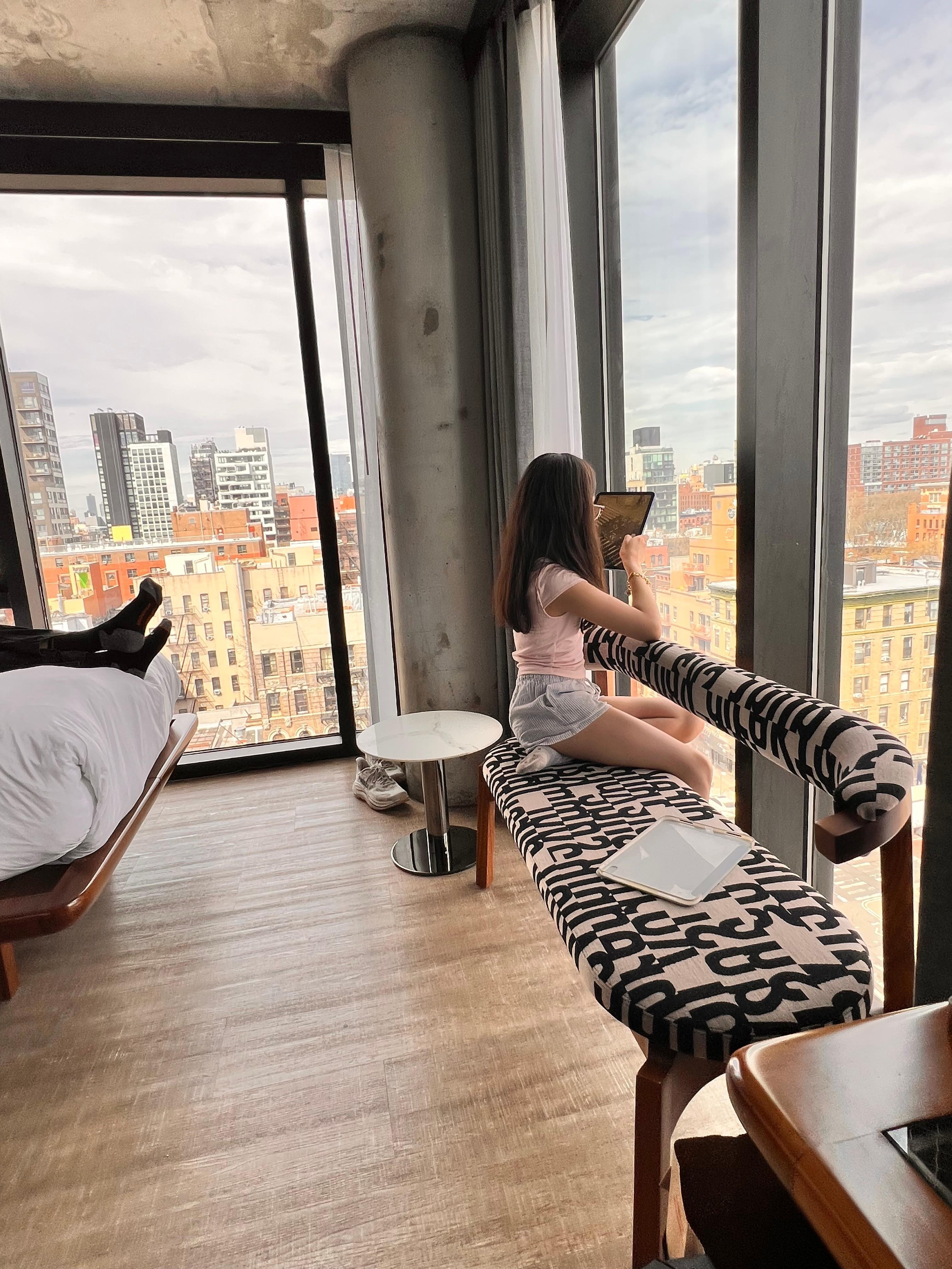 Clean rooms with high quality finishes and amazing views! We had a corner room on the 11th floor (no balcony) and the view was amazing. The street is bustling in the morning with coffee shops and at night with bars. Tons of amazing food nearby. We loved the open air cafe and beautiful sitting area in the lobby. More of a walk to the subway, but manageable, and just a quick ride to La Guardia. Quick walk to Williamsburg bridge. Check-in and room access was all digital but the lobby was also staffed with friendly people.