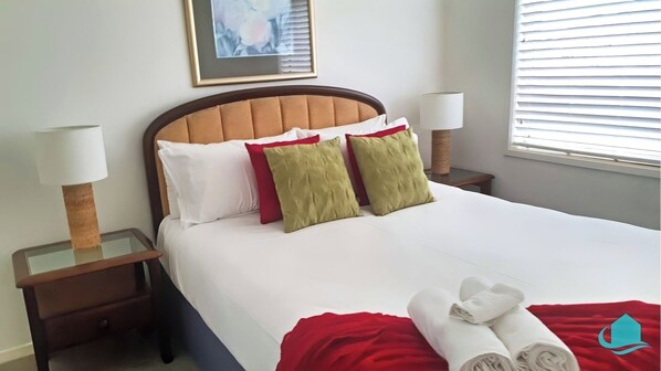 Accommodation includes three bedrooms positioned at the front of the home, ideal for families. The master bedroom includes an ensuite, while the remaining bedrooms share a modern bathroom. Bedding consists of two queen beds and a double sofa bed.