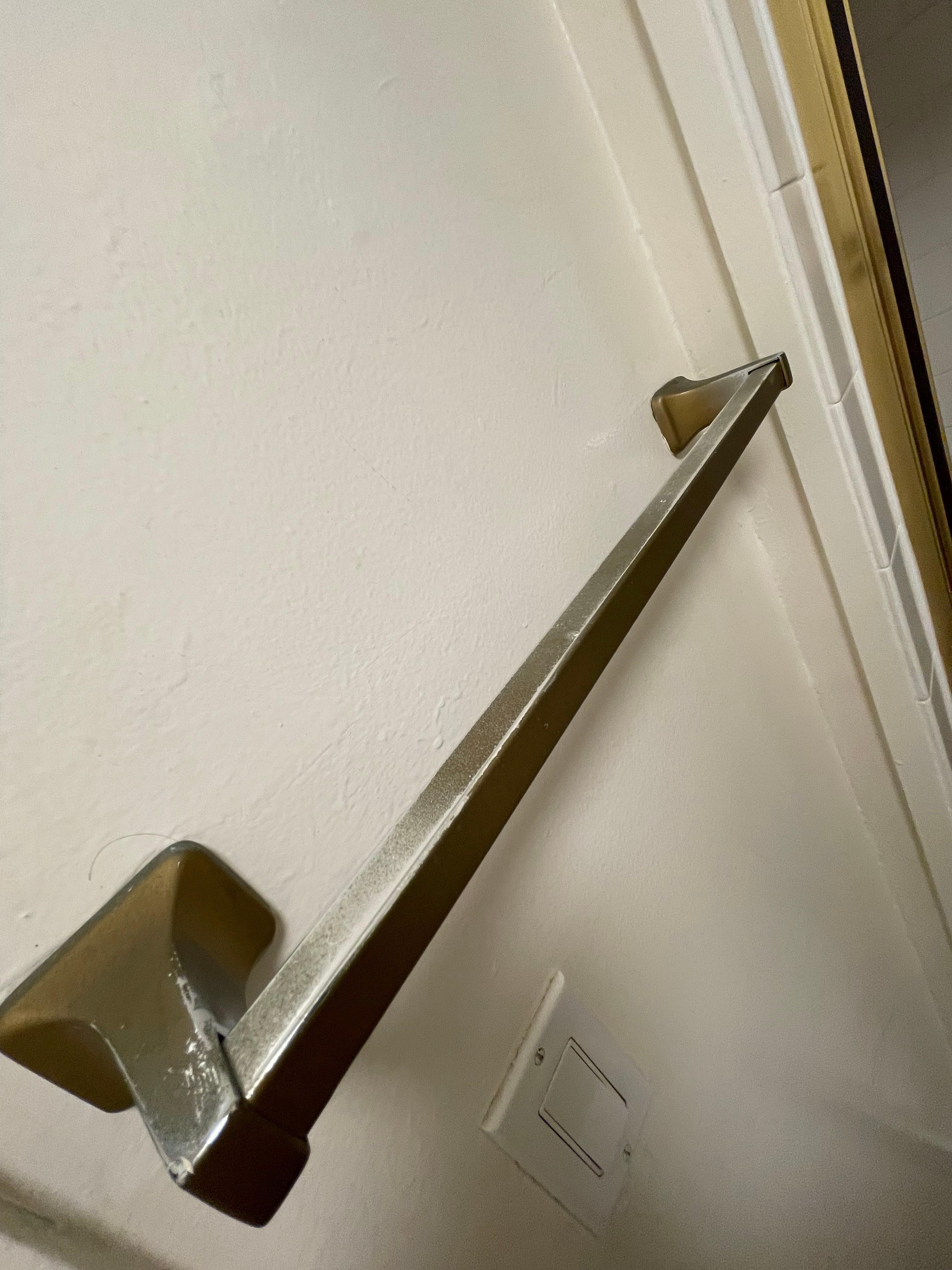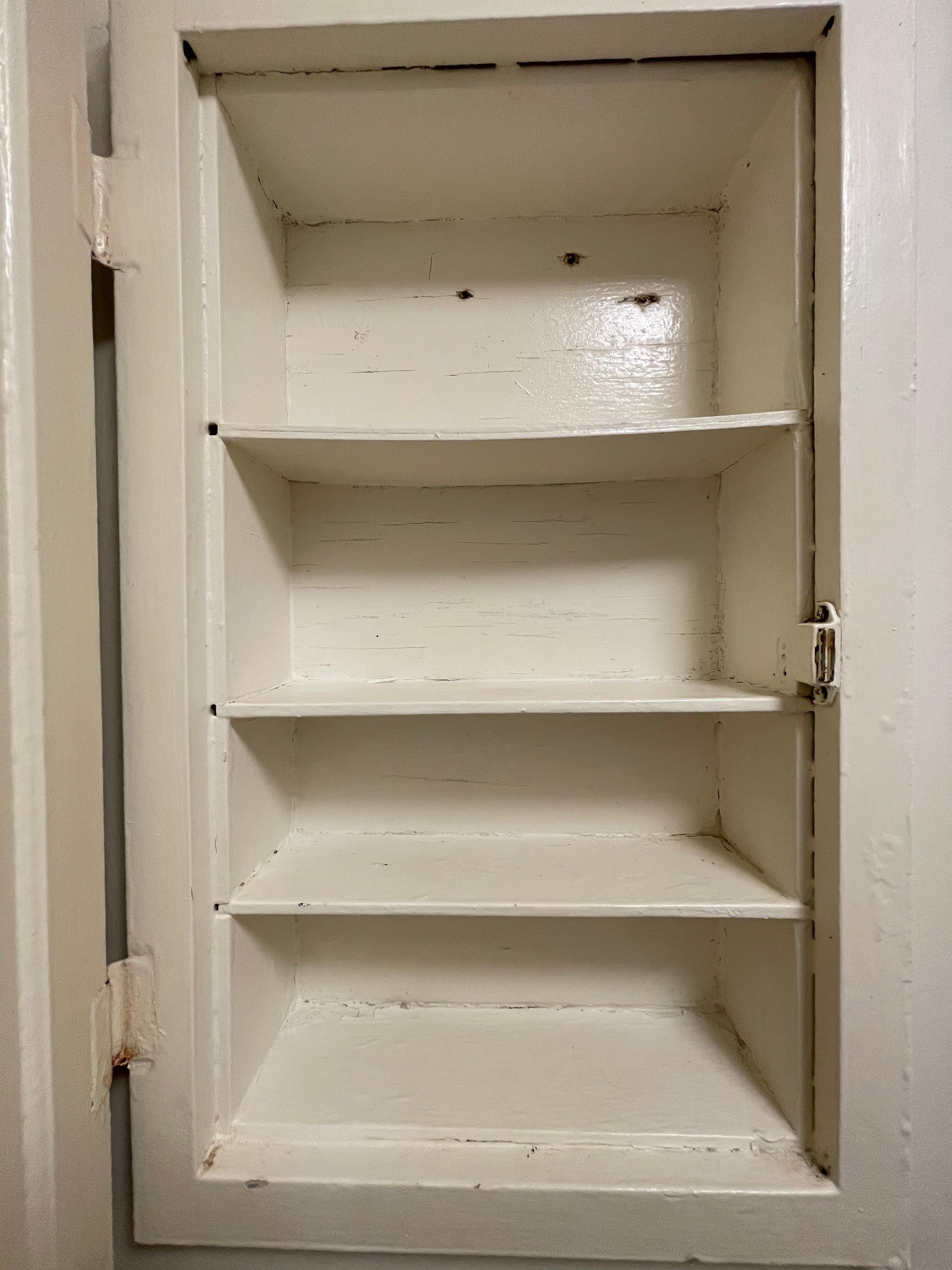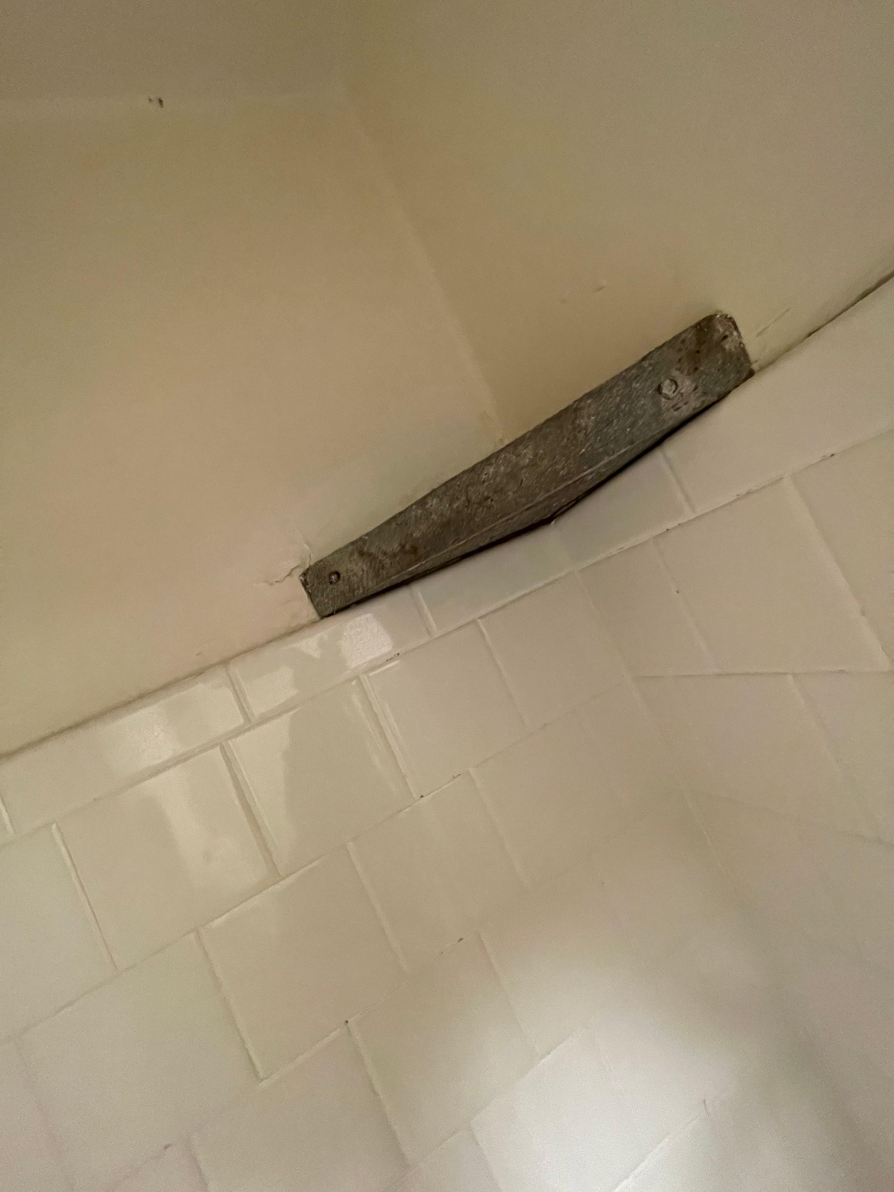 Upon entering, there is a distinct musty odor suggestive of mold. The bathroom fixtures and finishes are outdated: the medicine cabinet is constructed of wood with heavy layers of paint that appear to conceal underlying issues, the towel rack is loose and poorly secured, and the shower stall is very small, limiting movement. The soap holder is positioned high and shows rust. The showerhead assembly is mismatched for the space, causing water to spray from the pipe connection when the hot or cold valves are adjusted; both valves produce loud squeaking noises during use. There is no ventilation fan in the bathroom, which allows moisture to linger in the room for extended periods.