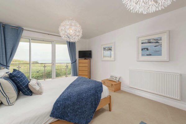 The master bedroom is bright with huge windows also including a sliding door onto the balcony, and white walls. The space includes a king-size bed, chest of drawers, and a wooden desk and chair for vanity use. There is also access to an ensuite shower room.