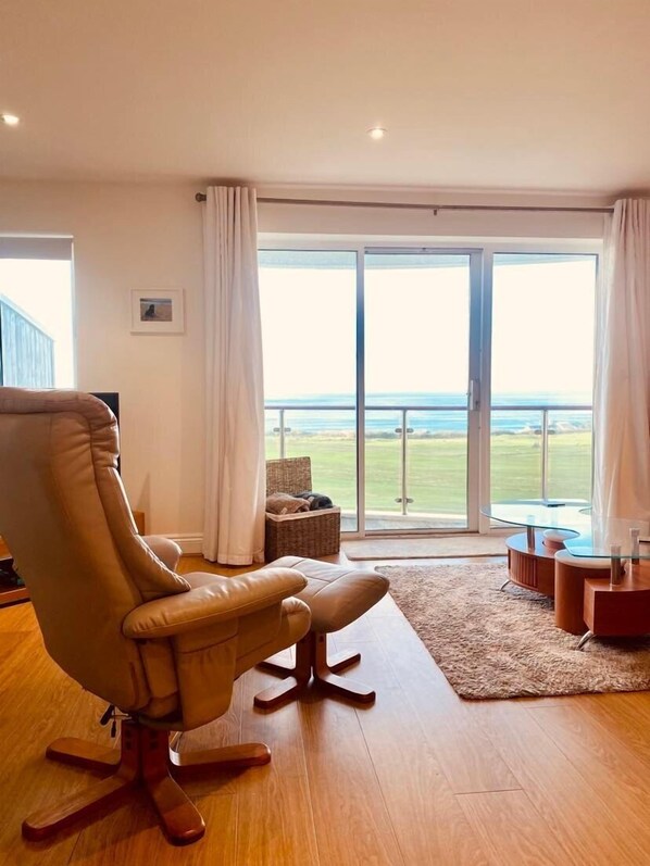 Den viktigste boenheten består av en stor hall med sete og skopbevaring som fører til romslig åpen stue / spisestue med havutsikt. Stor hjørnesofa med plass til 5-6, liggestol med fotskammel og 49 ”HD Smart flatskjerm-TV med Freeview, DVD-spiller og DAB-radio. Moderne spisebord på glass med seks matchende stoler. Alt fører til en stor privat balkong med plass til 4-5 og bord med spektakulær utsikt over Newquay golfbane og ned til Fistral Beach.