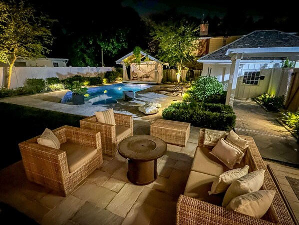 Outside you will find a private backyard oasis with optionally heated pool( seasonal May to Oct), resort-like sun loungers, a covered terrace with fire pit and a fantastic outside kitchen with large BBQ, wine fridge and a steak sizzling station. For the golf enthusiast there is also a putting green to improve your game!