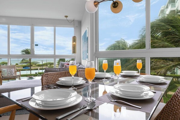 Denne 3BR-leiligheten ligger i Aquamarine Building i 2. etasje i Blue Residences og har den vakreste dekorasjonen for din strandferie. Så snart du kommer inn i denne leiligheten, vil den perfekte blandingen av farger og materialer fascinere deg. Du vil også bli overrasket over den spektakulære havutsikten fra stuen. Denne leiligheten har et fullt utstyrt kjøkkenområde, en benkeplass med avføring, spiseplass med utsikt og 3 soverom. Hovedsoverommet har en king-size seng med eget bad og havutsikt. Balkongen har tilgang fra mesteren eller stuen, bare åpne skyvedøren og kunne nyte øyas bris og nydelige utsikt. Andre soverom med to dobbeltsenger med fargerike påtrykte puter. Tredje gjesterom med en queen-size seng og fargerike puter. Hvert soverom har eget bad. TV-er i alle rom og stuer. Langs den spektakulære utsikten over havet, rett foran boligen i minutters gangavstand, er det en liten strand å gå og få føttene våte i det varme vannet i Karibien.