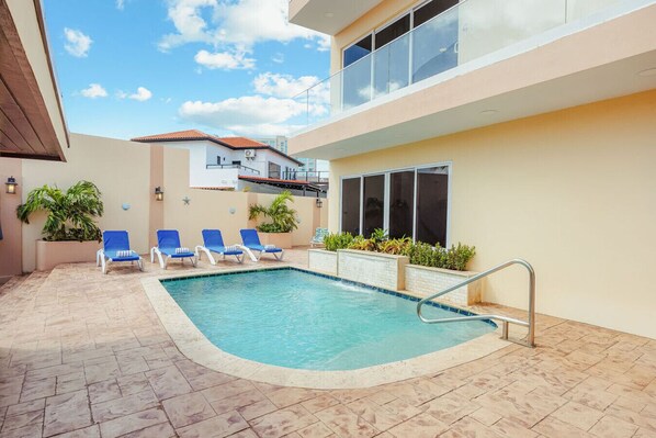 Step outside to a sparkling pool with lounge chairs, where you can soak up the Aruban Caribbean sun, take a refreshing swim, and unwind in a tranquil retreat that perfectly blends style and relaxation.