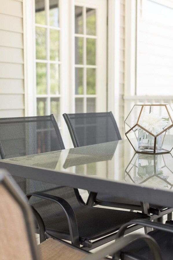 Patio: A covered patio area with outdoor seating, ideal for enjoying quiet moments in a serene setting.