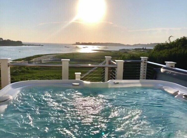 Det store teater- og Sportsbar-rommet nede, med både 56 "og 75" 4K high-def-TV-er, er et flott sted for barn - å se på sport, spille spill som søler ut i hagen. Dusinvis av spill lagres ved siden av spillbordet. Det innendørs, men ved vannkanten, badestamp, har en badestamp i full størrelse med utsikt over havet.