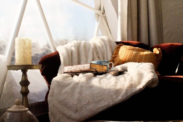 The dome deck allows for dining outside in warmer months, with propane camping stove provided for outdoor cooking, as well as a private firepit with firewood.