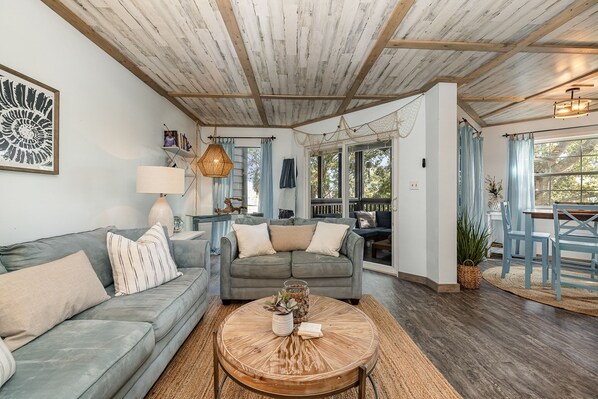 KITCHEN and LIVING SPACE ☆ Fully stocked kitchen with modern, stainless steel appliances ☆ Dining table capable of seating 4 ☆ Smart TV equipped with ROKU Stick ☆ Full Sectional couch ☆ Screened in back porch with seating