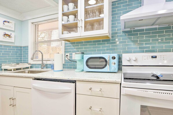 Gjesterom med airconditioning på Walk to Ocean: Home w/ Fire Pit in Atlantic Beach har kaffetraktere/tekokere og strykejern/-brett. Gjesterommene ved denne cottagen med 3 stjerner har kjøkken med komfyrtopp, mikrobølgeovn, gryter og panner/tallerkner/kjøkkenutstyr og oppvaskmaskin. Badene har dusj. Barnesenger/babysenger (inkludert) er også tilgjengelige.