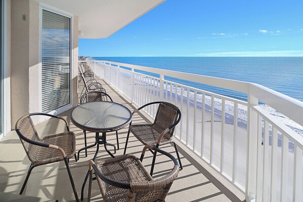 Crescent Shores, North Tower, Unit 1601. This wonderful, ocean front condo is located in the heart of North Myrtle Beach, SC, with 4 bedrooms and 3 bathrooms. You'll appreciated this beautiful end unit has many extra windows for views of the beach. The 26 foot, 16th floor, balcony gives stunning views of the beautiful Atlantic Ocean and the white sandy Grand Strand coastline. It's accessible from both the living room and the main bedroom with table and chairs for relaxing and dining.