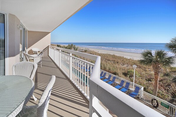 This updated 2 bedroom/2 bathroom Crescent Beach condo provides a spectacular view from both the main bedroom & family room, with access to large 26ft balconies that will maximize your oceanfront experience. An extra-large table & six chairs offers outdoor dining or refreshing beverages on the balcony overlooking the pool.