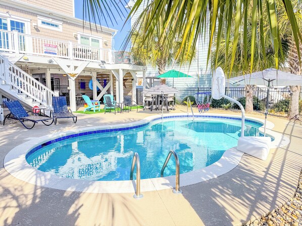 We stayed at Whispering Palms for 4 nights in early April. This house is in a great location, walkable to the beach and restaurants. The house is a newer property and has a lot of upgraded amenities. We paid to get the pool heated but unfortunately the weather was only in the 60’s to mid-70’s while we were there so the pool temperature was on the cooler side (even though it was heated, the temperature and ocean breeze made it feel cooler). However, it didn’t stop the kids from going in and having fun (the water was probably 84 degrees at the surface). The pool goes from 3 feet to 5 1/2 feet in the deep end. The house has 2 bedrooms on the top floor with a loft at the top of the stairs that features a pull out sofa, daybed, and TV (perfect for a play space for elementary/middle school kids...just remember to bring blankets for those beds as is stated in the listing). The other 2 bedrooms upstairs have their own bathroom inside each room and both have access to the patio in the front of the house. The main level has 2 bedrooms off the kitchen (one bedroom has a bathroom in it and the other has the bathroom right outside of it as that can be used by any guests). The kitchen has everything you would need, keurig, pots, pans, silverware, bowls, wine glasses, etc. We loved hanging out on the back porch as you can see the pool, small lake, and ocean. The patio around the pool has plenty of seating and a charcoal grill...it is truly an amazing entertaining space. My kids loved the swings underneath the porch (there is also an outdoor shower and a separate bathroom located where you park your car). Overall...great experience and would definitely go there again!