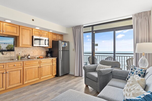 This remodeled unit is decked out with all the modern conveniences: TVs in the kitchen, and bedroom, a two-burner cook-top, and a full-sized refrigerator with granite counters in the kitchen. Welcome to your Ocean Front Retreat with views of the ocean from almost anywhere in the condo. The condo sleeps up to 6 and has one bedroom (two queen beds), one bathroom, and a separate living area (with a sofa bed), which is open to the kitchen. The remodeled kitchen has new everything including cabinets, granite countertops, tile back-splash, cook-top, and new appliances. The kitchen is also stocked with any items you might need for your stay including pots, pans, glasses, utensils, cheese grater, cutting board, can opener, knives, coffee maker, and veggie peeler. The kitchen is open to the living area which includes a dining table with 2 chairs, and a sofa that pulls out into a bed.