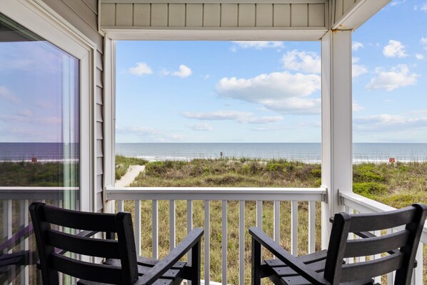 This is a great oceanfront condo with equally great hosts. I booked this condo very last minute. Had a few questions and got answers within minutes. After booking immediately got simple but detailed check in instructions. Condo was spotless. Very nicely decorated and great furnishings. Kitchen was well stocked with very nice appliances, dishes and silverware. Full size side by side refrigerator with cold water and ice dispenser was so nice. Condo is on the second floor of a 3 story building. First floor has a view of the dunes. This condo perfect ocean views from inside and on the deck. Trex deck furniture on the balcony was so nice. My wife has some mobility issues but had no problems with the one flight of stairs up to the condo. There is no elevator in the building. Down the stairs and you are about 12 steps to the sand! So nice. Didn’t use the pool as it was quite chilly the week we were there. My daughter did enjoy the sun chairs around the pool and on the large sun deck. As she would say….condo was 10 out of 10!