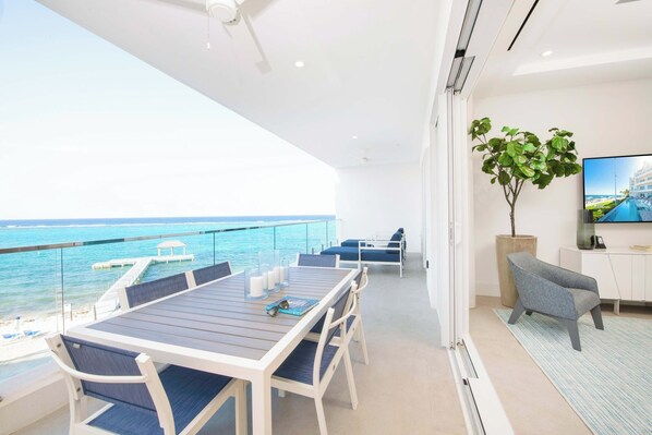 A formal indoor dining table just off the kitchen seats 6. For meals with sweeping oceanfront views, an outdoor dining table on the balcony seats 6 as well.