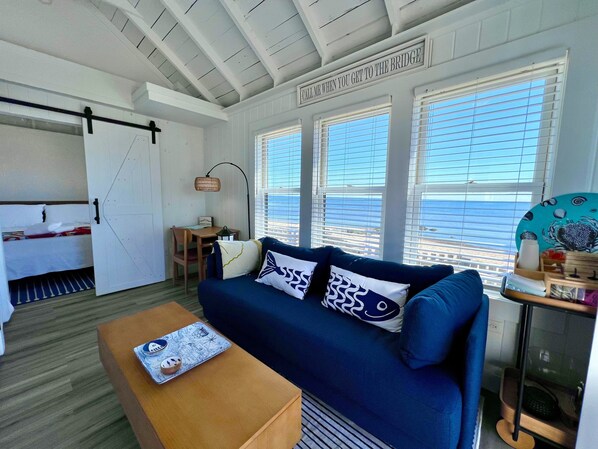 We enjoyed our stay at Serendipity. Communication from the agent made accessing the property easy and convenient. The location was perfect and the property had just about everything we needed for our stay. There were a few things we did feel could be improved. We would have liked to sit at the high bar outside overlooking the beach, but there weren’t any chairs there. Hooks on the walls in the bedroom would have made it possible to hang up our jackets, etc. and really are necessary as storage for clothing is limited. Also two of the windows were missing screens so we could not open them. None of these small issues prevented us from enjoying our stay and we would return.