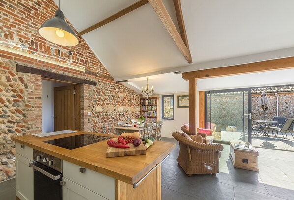 Enter the Barn into the bright and airy open-plan living area. The sitting room area provides ample seating for all with a television perfectly positioned to enjoy your favourite movie or box set together, or to try out a film from the small selection kindly provided by the owners. Across from the sitting area you will find the well-equipped and modern kitchen, with a central island perfect for preparing your holiday meals, or to enjoy a solitary coffee in the morning. An additional seating area, where you can relax with a book from the selection on offer, is thoughtfully positioned in front of the large, glazed sliding doors leading onto the rear enclosed patio area.