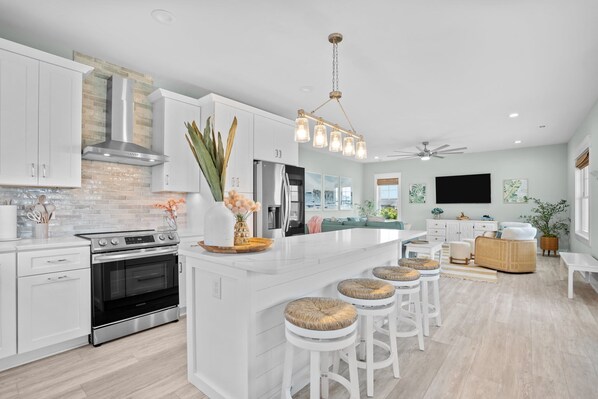The home features a spacious and stylish interior designed with your comfort in mind. The modern kitchen is fully equipped and boasts barstools at the island, perfect for casual dining and socializing. The living room is designed for ultimate beachy comfort, offering a space to relax and unwind surrounded by coastal ambience. Accommodating up to 11 guests, our home includes two king bedrooms, one queen bedroom, and a room with a double bunk bed and an additional twin bed. Ensuite bathrooms are available off the king bedrooms, with a third full bathroom available for all other guests.