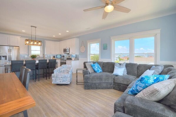 Serenity Now-Beautiful Beach Walk 5 BR, 3 1/2 Bath nybygg hjem med svømmebasseng, dobbel dekk med en invertert planløsning for å maksimere visninger! Nøye oppmerksomhet til detaljer med et stort åpent familiehus, spisestue og kjøkken full tilkobling med trådløst høyhastighetsinternett. Det private bassenget har en utendørs dusj, kullgrill, og stor betong uteplass perfekt for underholdende. Det er rikelig med uteservering (sjeselonger, stoler, rockers, sidebord, spisebord for å nyte utsikten på dekkene og slappe av rundt bassenget. Det store kjøkkenet har alle fasiliteter, inkludert granitt benkeplater, en Keurig, stor spisesal og separat stort spisebord ideelt for å nyte mat og mat. Stunning private Master suite har stor walk-in fliser dusj. Nyt en kald drikke og selskap med venner og familie, mens barna nyter en dukkert i bassenget. Gjør din reservasjon i dag og nyt en ferie med Serenity Now. Soveplass til 16