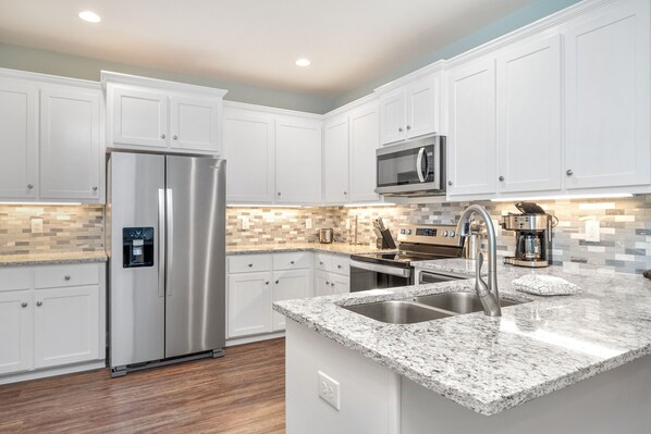 This is a beautiful, new or newly remodeled home. The appliances are newer and function as they should. We stayed here during a local baseball tourney so it served our purpose very well. Overall this is fine home and great alternative to a hotel. A couple of points to make: The TVs only stream. You cannot (or I couldn't figure our how) get local, over the air channels. No local news or weather. Our stay was during the NCAA March Madness. We couldn't watch any games at night. I left a voicemail with the property managers after we checked in (Sunday) to see if they could provide any instructions about the TV, but my call was never returned. On the flip side, the coffee maker lid malfunctioned and housekeeping was quick to respond when phoned. Another point; This home is on a busy road where the speed limit is 45 mph. At times it was very difficult to cross and walk to the beach access. Also the traffic noise at night can be loud. We'd rented a golf cart thinking we could take it to the beach but honestly I was afraid to try and cross this highway on it during the day. These are not to take anything away from this property. It's a beautiful, well-kept unit and the keyless check-in and entry is very convenient. It's location is a short drive to restaurants. I'd definitely consider staying here again and prepare myself accordingly.