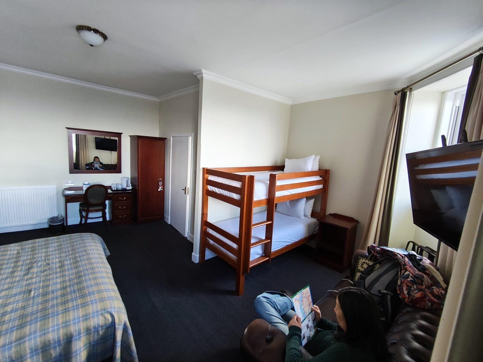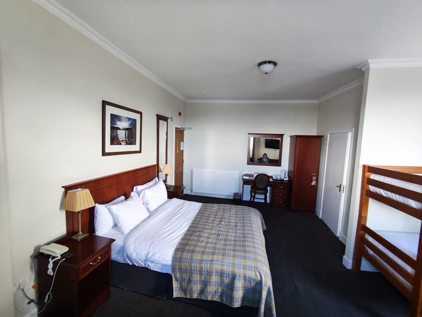 The hotel is very well situated in heart of town. We booked a superior double room, which advertises as one double bed in a room, we were given, what I think was a family room with a double bed and a single bed. The hotel room was clean and beds comfortable albeit very dated. The hotel, is in need of an overhaul - dated, painting and carpets replaced. The landing at our room had two mop buckets collecting water from a leaking roof! I would like to add that the staff are very nice and friendly