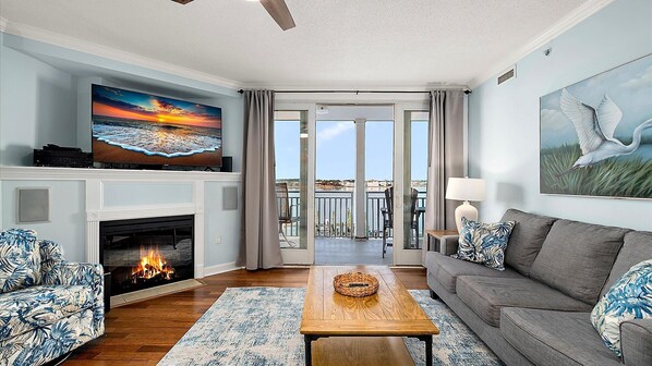 To store vinduer og 8 'glassplater gir fantastisk utsikt over vannet. Det er 4 svingbare stoler med bord på balkongen slik at du kan suge utsikten, spille kort eller lese. Tilgang til balocny er fra skyvedører i flott rom og hovedsoverom. Flott sted å trekke seg og slappe av fra dagens aktiviteter!