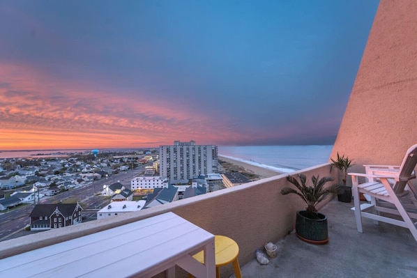 Come vacation at this direct oceanfront penthouse on 85th Street! This 3 bedroom, 3 bath two-story penthouse offers plenty of space for the entire group to stretch out and enjoy. Expansive bay and ocean views, the oversized balcony is the place you will want to be! The building offers a heated pool and is only a few small steps to the beach. For your convenience, this unit has a washer and dryer inside the property. This property offers both a Keurig and a standard coffee pot, providing you with a variety of brewing options to start your day. In addition, games, beach chairs, and beach toys are available for your use!