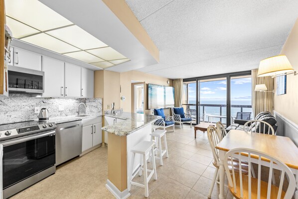 The Living Area is welcoming with plush furniture, an Extra Large Flat Screen TV, Free WiFi, and Ocean Views that are nothing short of mesmerizing. Warm and inviting, while still cool and relaxing, it's the perfect place to gather and reconnect with family. It is clear that no stone has been left unturned to create this dream Family Beach Retreat.