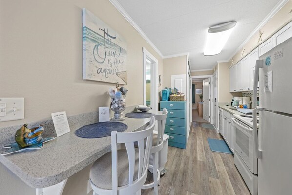 This condo is super cute for a couple or a couple with a small child. It's close to the beach and has partial views of the ocean and bay. We initially had a kerfuffle with the keypad and entry, but communication was prompt and we gained entrance promptly. The kitchen had everything you need as far as cookware, appliances, cute coffee bar and dishes and glassware. The galley eat-in area is a little tight as far as someone eating at the bar area and someone passing by. Towels and linens were furnished so we didn't need to lug those along. The one bed was definitely more comfortable than the softer mattress. Something about the mattress pad/toper had me sweating throughout the night. The place could have been a little cleaner as far as we are concerned, and we are not super picky. I wiped down certain kitchen areas, bathroom cabinets and dresser drawers, but refused to do baseboards, etc. The plusses on this condo far outweigh a couple minor negative things. Would definitely stay here again.