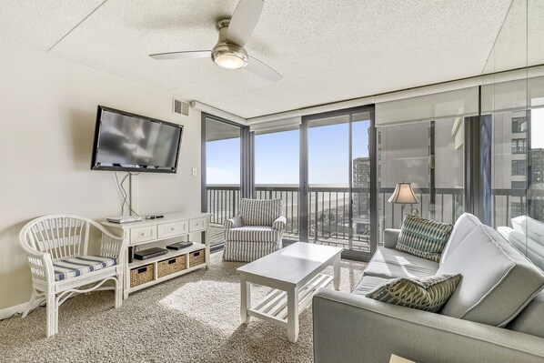 Sunlight and views of the ocean bounce throughout this condo, where you'll find a full kitchen, floor-to-ceiling windows that frame the water, and a private balcony overlooking the beach that's accessible in both the living room and the primary bedroom. For your evening entertainment, you'll have free WiFi throughout the condo and four TVs - one smart TV and three with DirecTV service.