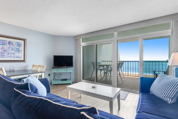 As you return home from a day spent on the beach, you can toss the day's towels in the washer/dryer, cool off in an air-conditioned living space, and fix a few cold drinks and snacks in the open kitchen with stainless steel appliances and a breakfast bar. The private oceanfront balcony has a table and chairs for al fresco dining, while both the living room and the primary bedroom have flatscreen TVs for your evening entertainment. Free WiFi is provided as well.