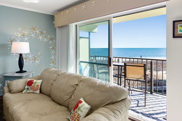 You will have one of the best views of the ocean from the private balcony. This unit was recently renovated with a modern, beach theme. The kitchen is completely modern with great appliances and great amenities (ice maker, coffee maker AND Keurig, blender, toaster, toaster oven, stock pot to cook crabs, etc.). All of the balcony furniture is new.