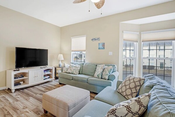Welcome to the sleepy town of Ocean View! This charming, three-level townhouse will grant you the opportunity to enjoy ocean breezes, soft sands, and, of course, great access to nearby beaches. This retreat has been beautifully appointed and updated to provide guests with the ultimate relaxation experience. The main entrance to this home away from home is on the first level where you'll find the laundry room with a washer/dryer. Then, you have a full bathroom with a walk-in shower. The living area offers a comfortable queen sleeper sofa and an armchair with a footstool, a wall-mounted flatscreen TV with an Amazon Fire TV stick, a dining table that seats four, and access to a concrete patio with a private gas grill–this entire level is perfect for gatherings, movie nights, and cookouts. Climb up the stairs to the second level where you'll find the living room, dining area, and kitchen. The living room is well-equipped with a queen sleeper sofa, loveseat, another flatscreen TV with an Amazon Fire TV stick, some board games, an armchair by the window, and a ceiling fan. The dining table is right by the kitchen and it seats six, however, if you'd like to dine al fresco, the outdoor dining area on the balcony will be your perfect choice– it seats six! The kitchen is fully equipped with all the essentials and cooking utensils to make meal prep a breeze. Keep your groceries nice and fresh inside the full-size fridge, prepare full-course meals in the stove/oven, heat leftovers in the microwave, or enjoy a steamy cup of coffee from the coffee maker. This level also offers a half bathroom. On the third and upper level of this townhome are three bedrooms and two full bathrooms. Bedroom one and two have ceiling fans; bedroom number one has its own ensuite full bathroom with a walk-in shower. The other full bathroom has a tub/shower combo. Guests of this charming retreat will be granted access to a shared outdoor pool (open from Memorial Day through Labor Day) and tennis court at no additional cost!