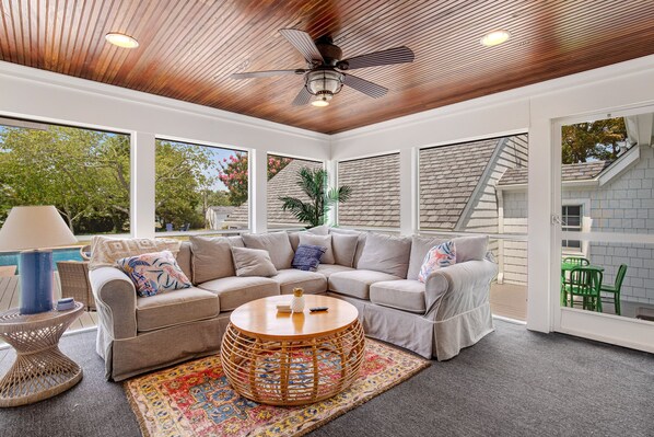 Inside, this gem is filled with coastal themes, soft pastel paint, and plenty of room to spread out. When everyone gathers inside, each guest can take their pick of reading in the sunroom, reminiscing with loved ones in the bright den, or heading into the furnished living room to stream favorite movies and shows on the TV. When appetites build, the full kitchen is outfitted with a gas range, modern cookware, a deep farmhouse sink, and a dishwasher to make meal prep and cleanup a breeze. A desk area and high-speed WiFi are available for those who need to get some work done while away.
