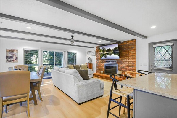 Inside, you’ll find a newly renovated stylish, open-concept design featuring two cozy living rooms, a fully stocked kitchen with everything you need to prepare meals, and a farmhouse sink, LED Accent color changing lighting, and a 70” TV—ideal for relaxing after a day of adventure. The home boasts three beautifully furnished bedrooms for restful nights, plus a hide-a-bed couch, sleeping for 8. Two modern bathrooms. One tub and one walk-in shower.