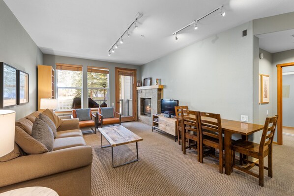 Upon entering this condominium, you'll find a sense of spaciousness and comfort throughout the space. A fireplace, television, sleeper sofa and two leather chairs create the perfect gathering zone for your family or friends. This area is a great spot to gather and swap stories of the day.
