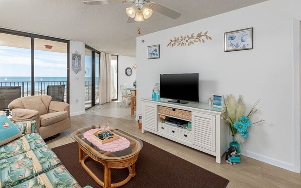 Si hei til bukten! Det er et flisegulv med et teppe når du kommer inn, og et veggmaleri på gangen. Soverommet har grønt teppe og en konge kurv seng med blomsterbed. På hver side av sengen, et nattbord med en lampe, og det er en kommode med et speil. En annen kommode er inkludert, og en flatskjerm-TV henger på den ene veggen. Det er en tapetkant øverst på veggene. Badet har blomstertapet og dusj / badekar. Et rotting- og glassbord sitter i spisestuen, med fire rutete polstrede stoler. På kjøkkenet, to matchende avføring i baren, med hvite benkeplater og hvitevarer og tapet av elfenben. Hiet har grønt teppe og en kurvssofa med blomstermønster, og en matchende stol og osmann. Det er også en lys rotting hvilestol og kurv og glass bord og lamper. Underholdningssenteret har stereoanlegg, videospiller, flatskjerm-TV og en DVD-spiller. En bakerholder med kuriositeter gir et personlig preg.