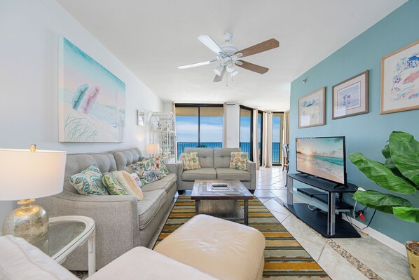 Stuen har en fin havblå farge med matchende sofaer med sluttbord og lamper for å få ut strandstranden. Mellom sofaen er en sovesofa med queen size-seng. Stuen er sentrert av et nydelig eikebord over et matchende området teppe for å knytte alt sammen. Over fra sittegruppen er en stor flatskjerm-TV på et svart underholdningssenter.