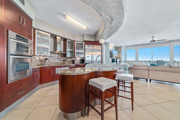 The condo features a stylish wet bar with a top-of-the-line wine cooler and ice maker, adorned with frosted glass - perfect for hosting unforgettable gatherings.