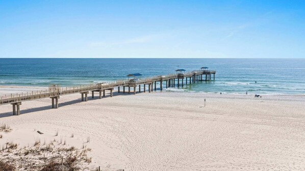 Step outside to enjoy the resort-style amenities, including a sparkling outdoor pool for cooling off or lounging in the sun. A fitness center is available for those who like to stay active, and direct beach access means you’re just steps from the sugar-white sand and turquoise waters.