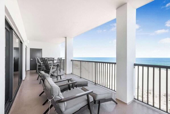The spacious living room features a comfortable queen size sleeper sofa, a 60' 4k HD smart TV and a DVD player. Both the living room and master bedroom open directly onto the large wrap-around balcony which offers spectacular views of the white sandy beach and the beautiful turquoise water of the Gulf of Mexico. This corner unit gets wonderful natural light and captures panoramic views. The balcony features Pollywood Adirondack table and chairs, creating a comfortable and tranquil lounging space.