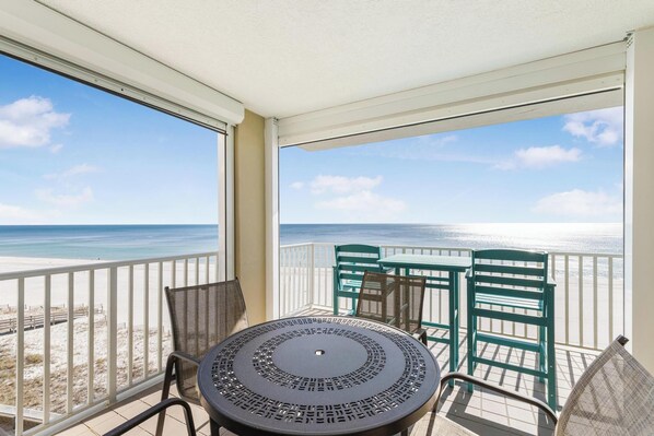 Inside this open concept space you will find light flowing in from the private balcony with incredible views of the Gulf of Mexico. The well-equipped kitchen features stainless steel appliance and is stocked with pots/pans/utensils. Step into the dining area with the dining table that comfortably seats six with additional seating for three at kitchen bar. The living space has a flat screen TV to relax after a day on the beach. This unit is equipped with a washer and dryer in the unit.