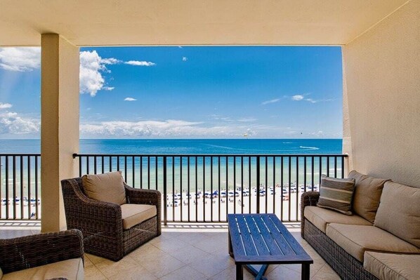 Oversized beach front deck with comfortable outdoor seating!
