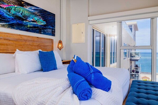 Surrounded by windows all around, this unit gives you a mixed view of the harbor, the turquoise waters of the Caribbean, and city making this studio unique. Kitchen is equipped with necessary utensils and small kitchen appliances to make your stay comfortable. King-size bed, dinner table and TV.