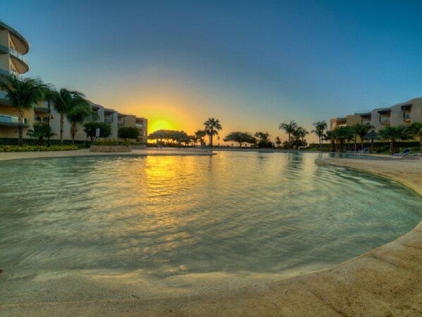 Directly across from Eagle Beach! Oceania is the only oceanfront condo complex in Aruba situated directly on legendary Eagle Beach. This lovely designer unit boasts all the comforts of home and enjoys the luxurious amenities of 4 freeform pools, racquet ball and tennis courts, and a fitness center onsite. Eagle Beach, which is continuously rated as one of the best beaches in the world, is located steps away from the front gate.
