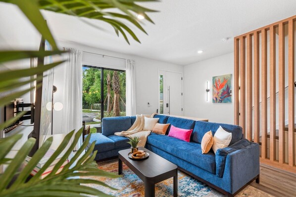 Dive into central Florida’s excitement with this chic 3BR 3BA + Loft home in friendly Kissimmee, FL. Admire its vibrant electric blue sofa, artistic decor, and sleek kitchen island, steps from iconic Disney World, Universal Resort, SeaWorld, and a myriad of captivating attractions for all.